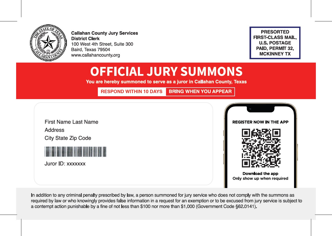 If you receive a jury card or communication through this new system and have questions, please contact the District Clerk's Office at (325) 854-5825.